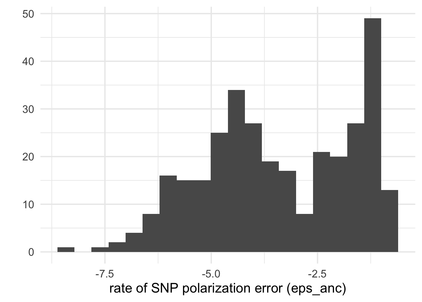 qplot(log10(dfe_sift$eps), bins=20) + xlab("rate of SNP polarization error (eps_anc)")+theme_minimal(base_size = 16)