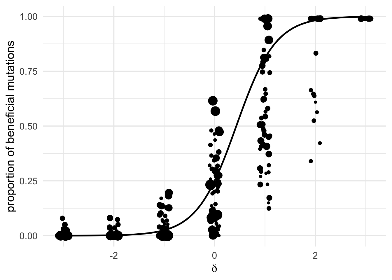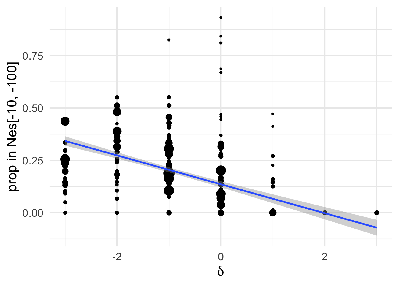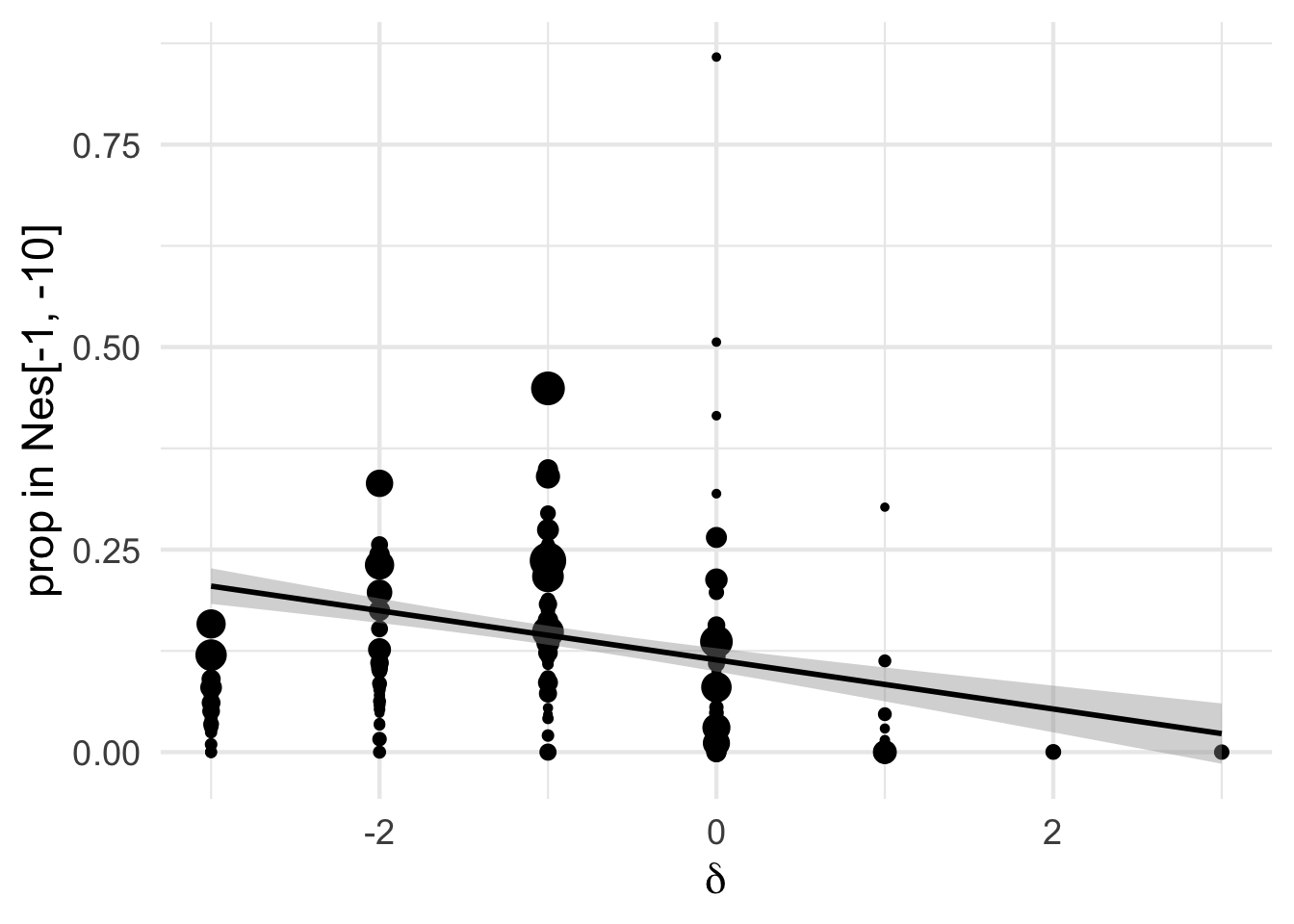 ggplot(aes(x=delta, y = log10(eps + 0.000001), size = sqrt(nsyn_counts), weight=sqrt(1+nsyn_counts) ))+