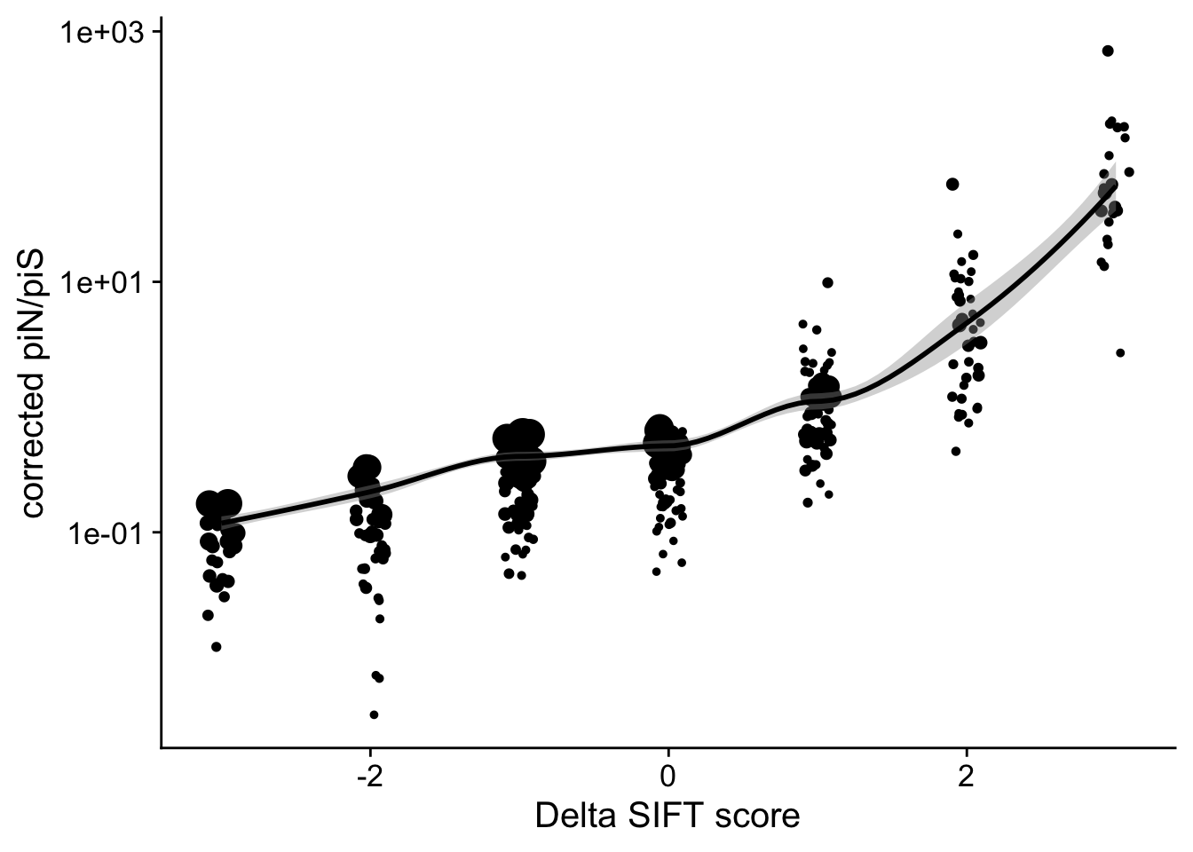 geom_jitter(height = 0, width = 0.1, aes(size = sqrt(1+nsyn_counts)), color="grey40")+