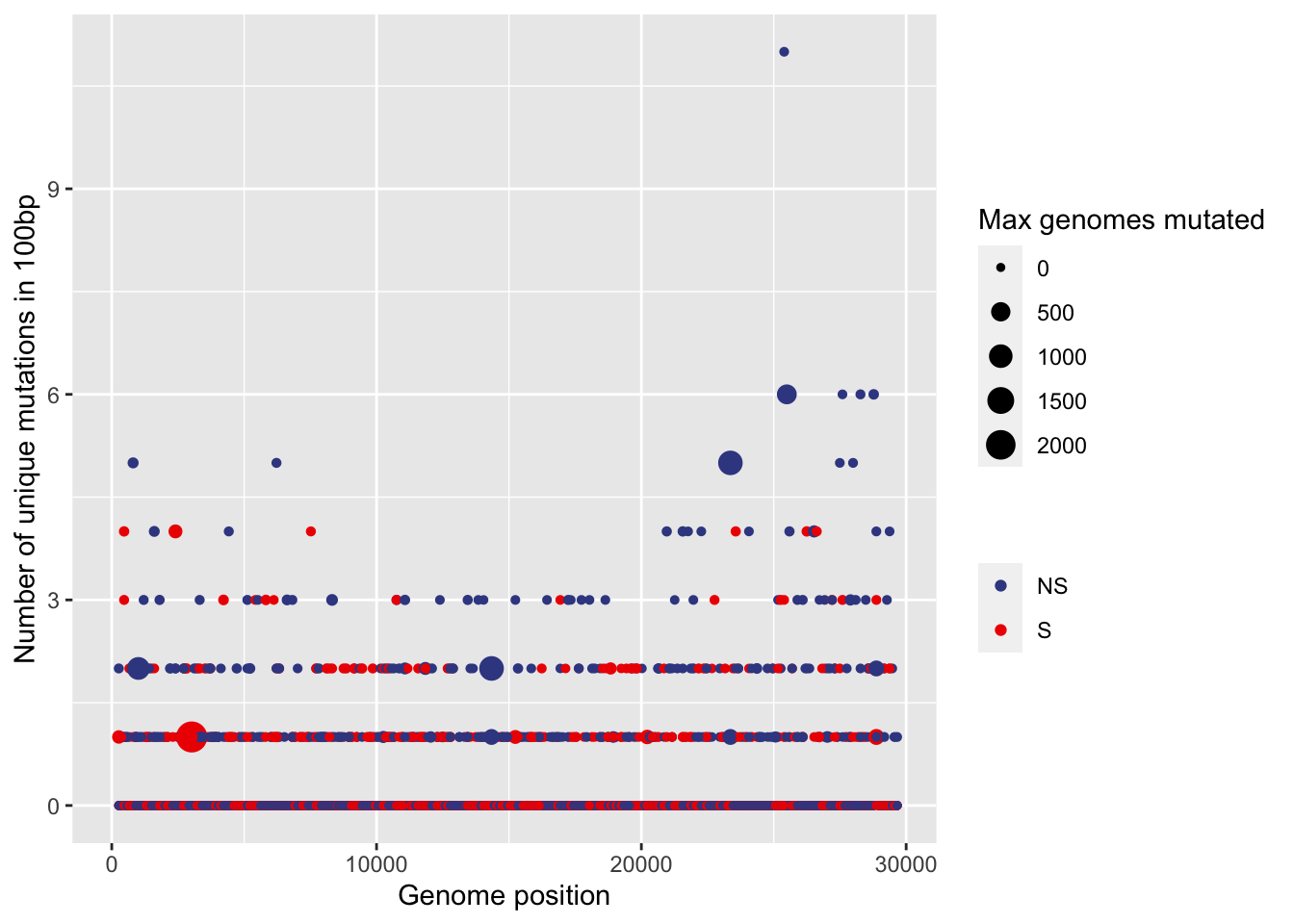 ggplot(data100_annotated, aes(x=window_start_gis, y=unique_mutations, size=max_genomes_mutated, color=type)) +