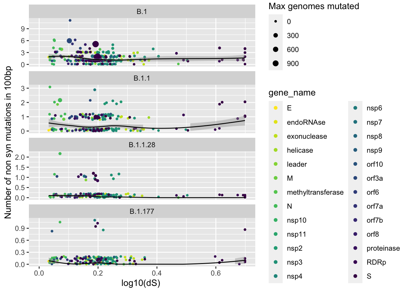 ggplot(aes(x= log10(1+W.G.dS) , y=unique_mutations, size=max_genomes_mutated, color=gene_name)) +